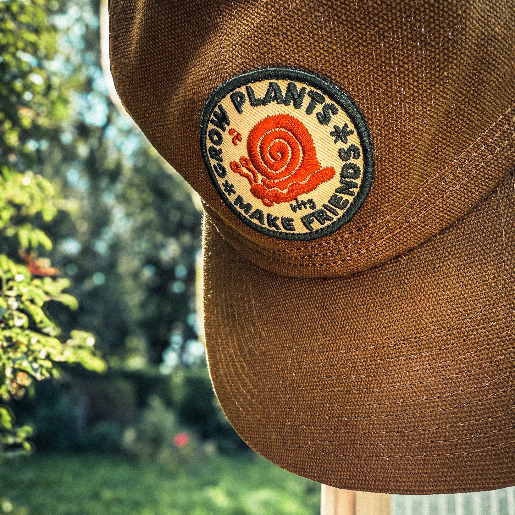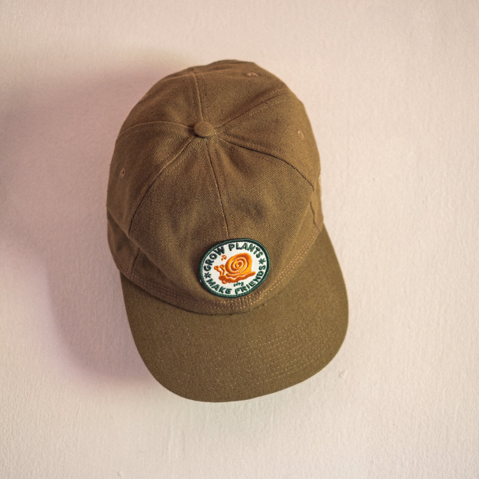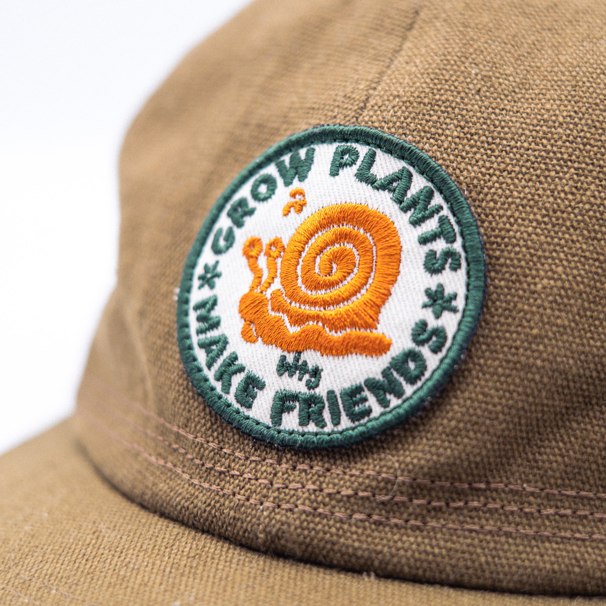 Organic cotton canvas six panel cap with embroidered "Grow Plants Make Friends" patch on the front, triple stitched detail all around and signature box stitching on the side.