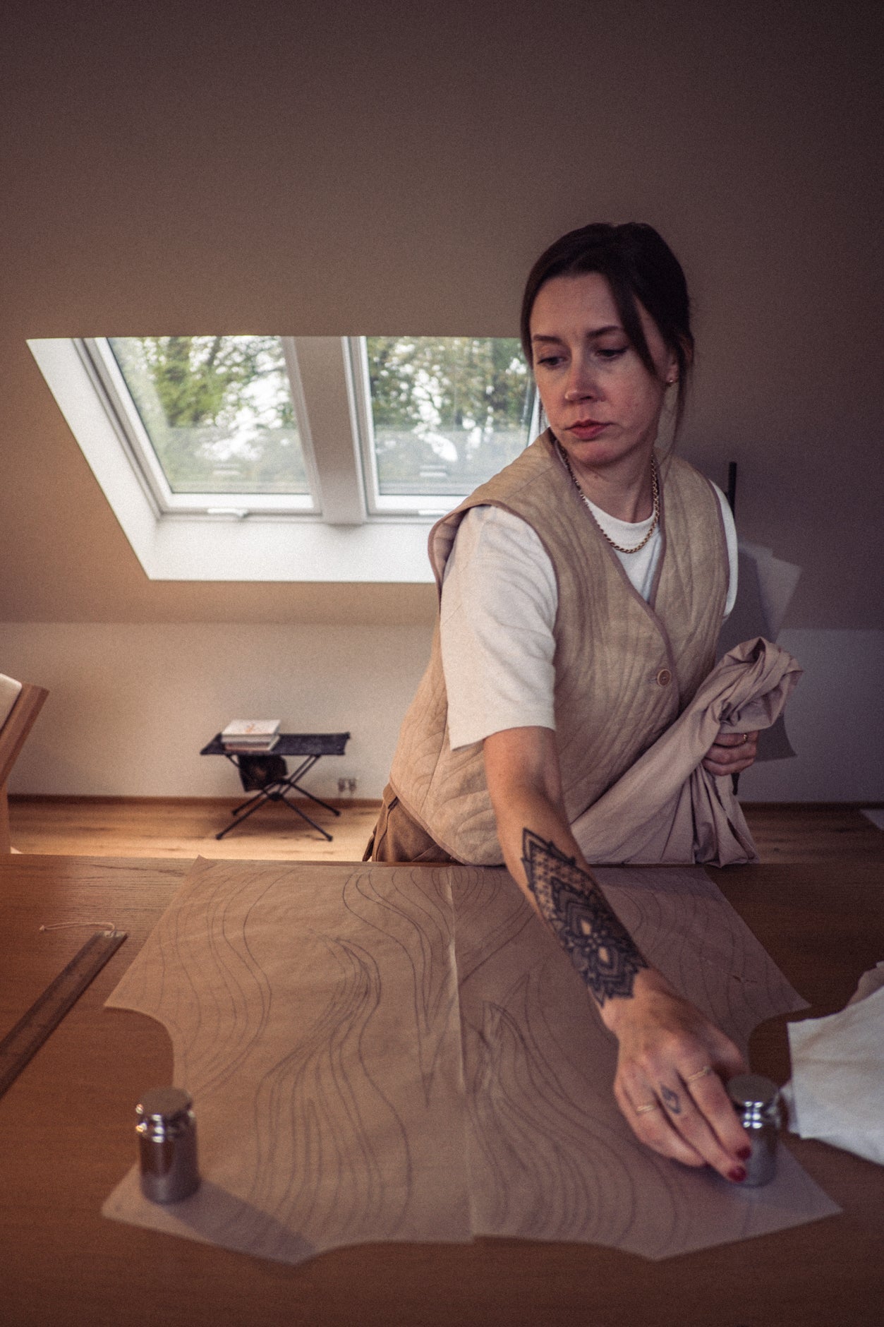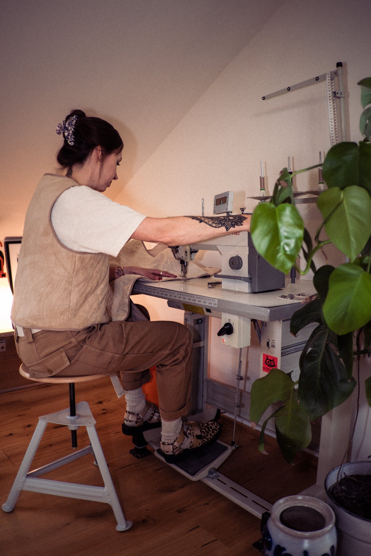 As Corinna is a trained seamstress and fashion designer we are able to produce this item completely in-house. Design, pattern making, cutting, dying (outer fabric only), grading and sewing is all done here in our studio with the help of our trusted Pfaff 1183 sewing machine.