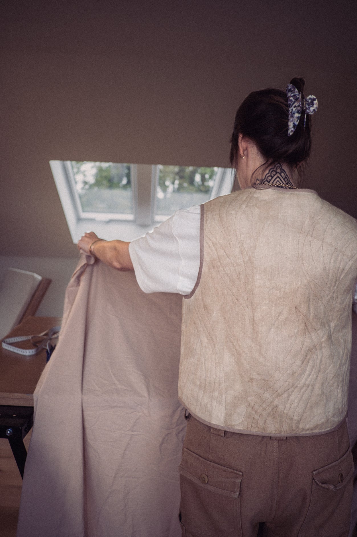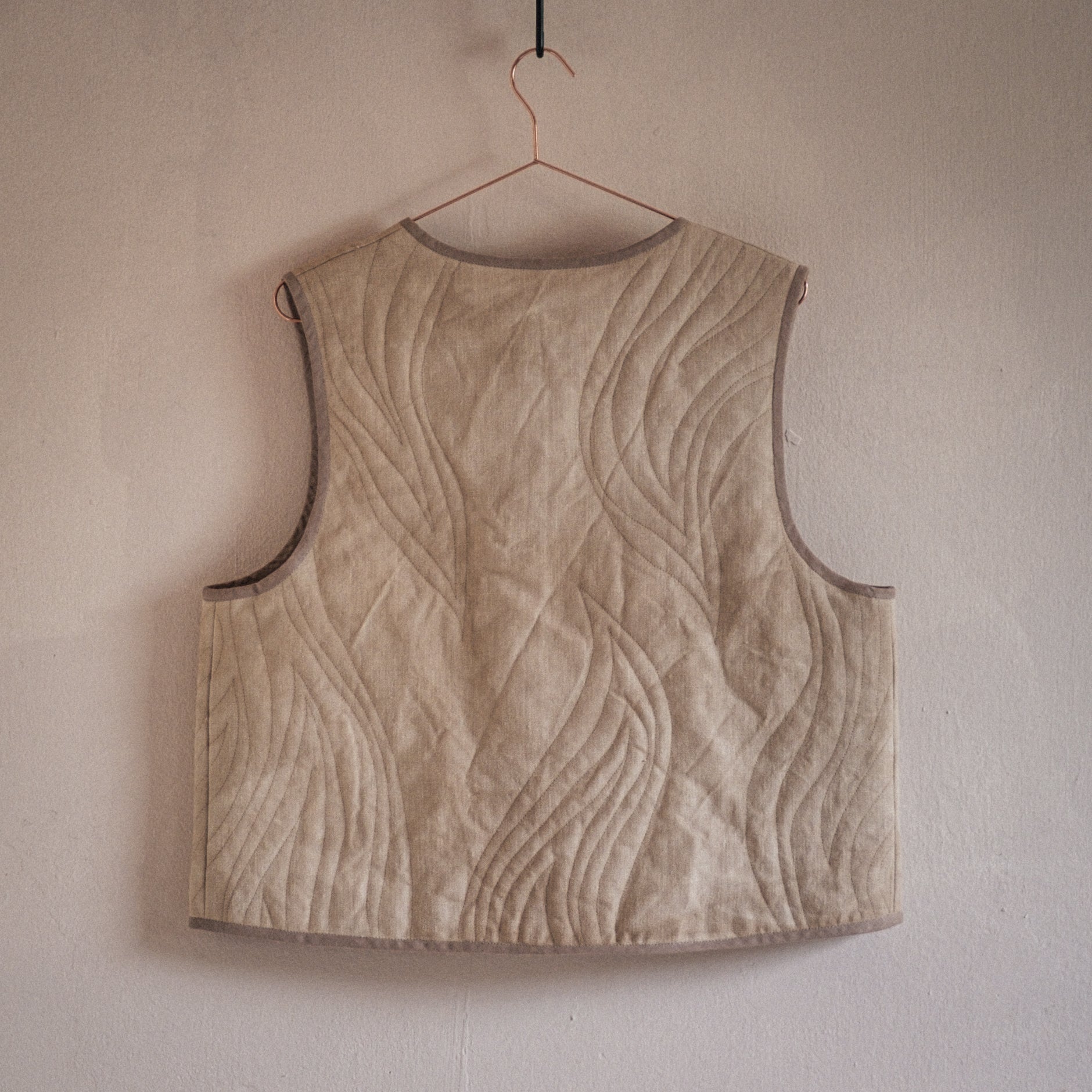 The outer fabric for the gilet is a durable 100% hemp canvas with allover custom quilting that was hand-dyed with organic black tea for an irregular, worn-in texture. The front features our regular "flow" pattern, on the back we use a "flow W" as visual.