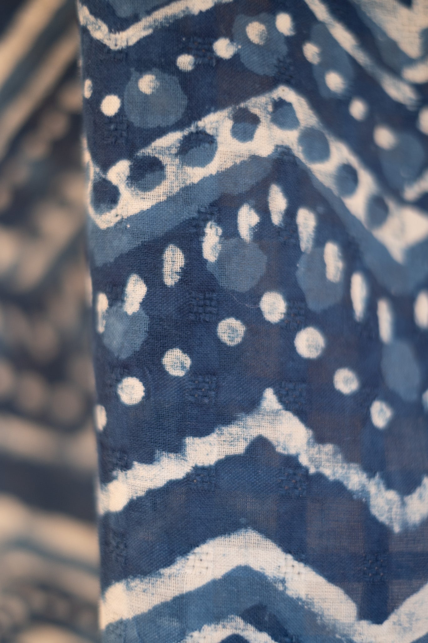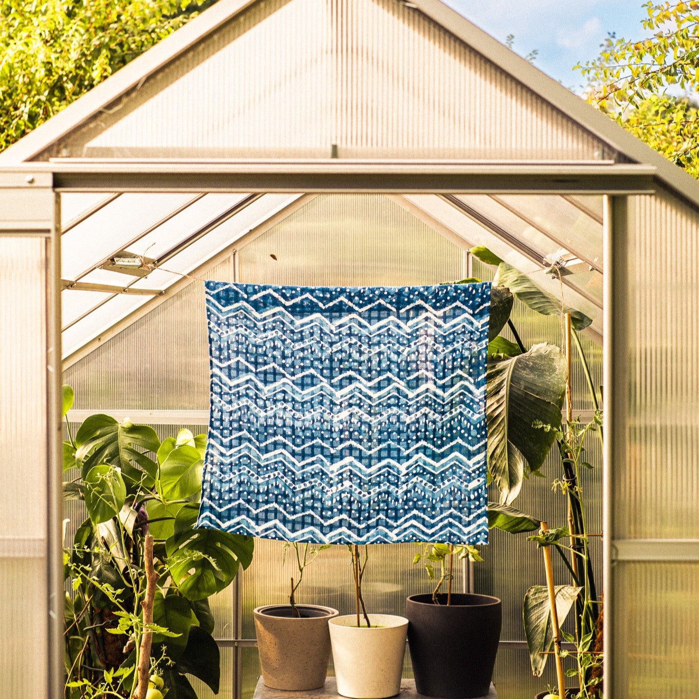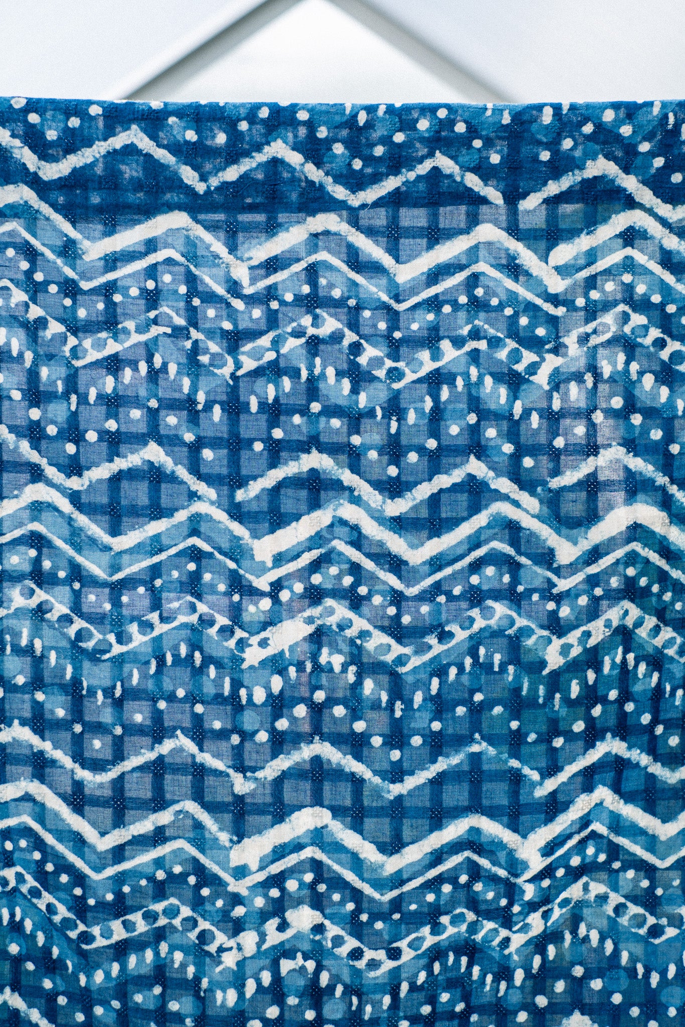 The fabric is a carefully woven organic cotton plain-weave with a unique pattern. It features a contrast Dabu allover printing, a traditional resist block printing method done with natural substances. Here the used color is real Indigo. It is carefully made in India which boasts a rich legacy in block printing that has endured for thousands of years. Sewing was done in our studio with a cotton thread to keep it all natural. Size: approx. 54cm x 54cm