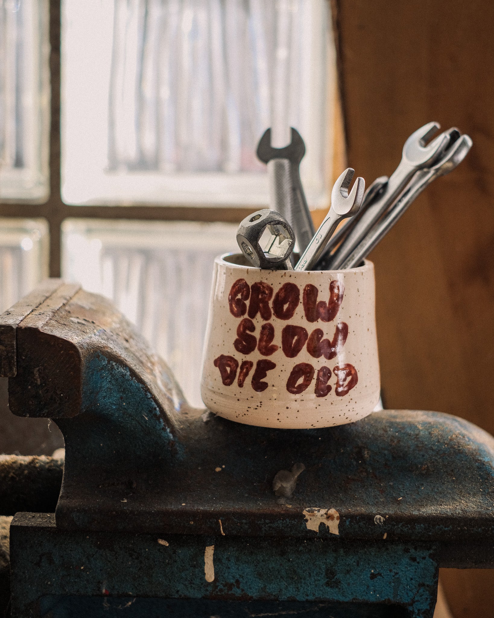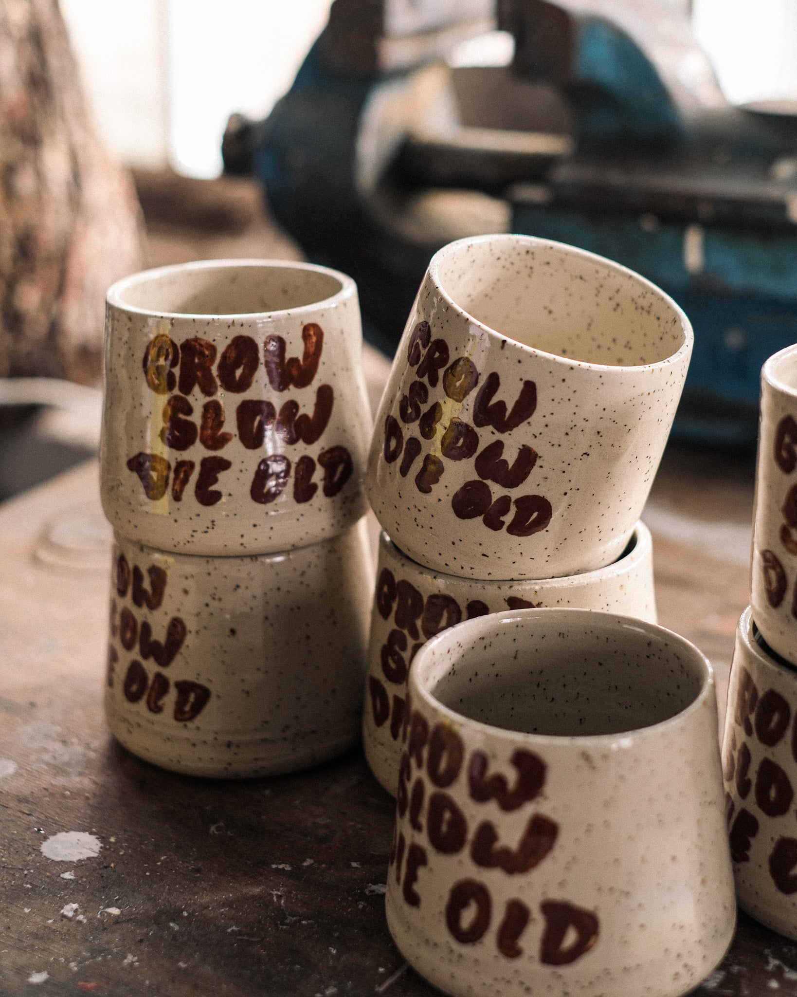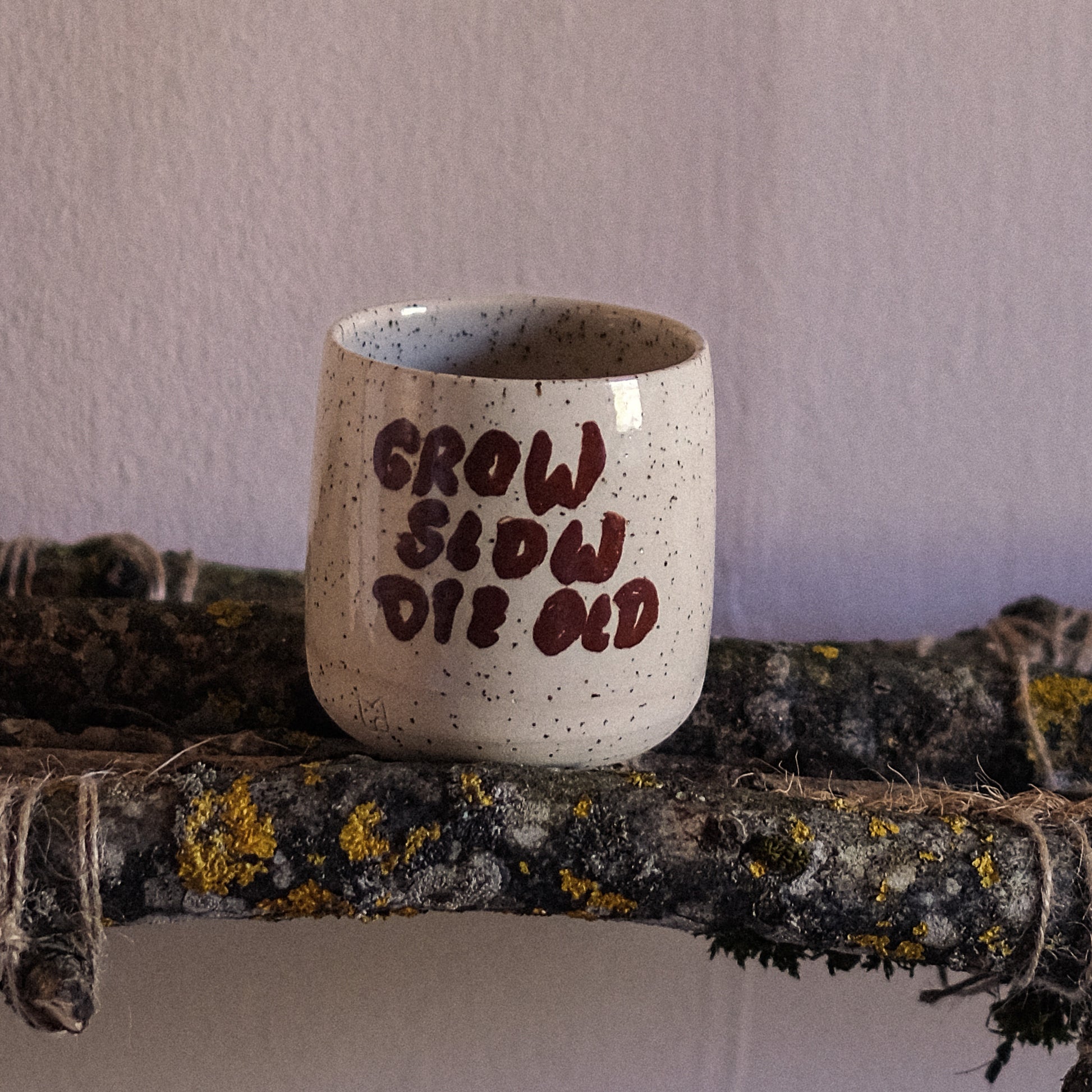 - Earthy clay with speckles and hand painted "Grow Slow Die Old" wording. Covered with a transparent finish
