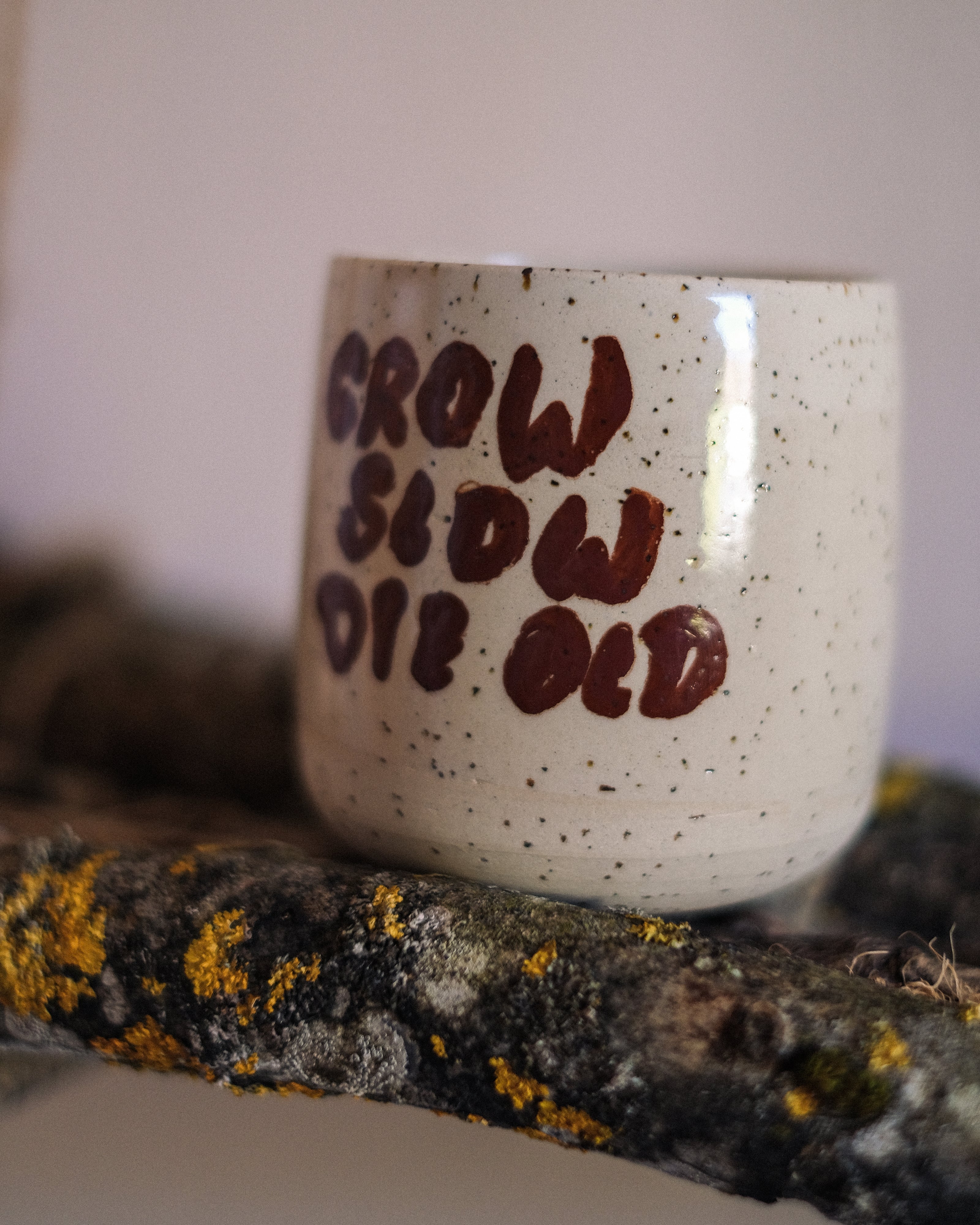 Earthy clay with speckles and hand painted "Grow Slow Die Old" wording. Covered with a transparent finish.
